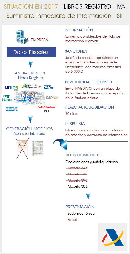 Con la implantación del SII cambiará el sistema de transferencia de datos de los Libros Registro de IVA. Será obligatorio enviar los registros de facturación electrónicamente, mediante la Sede Electrónica de la AEAT. Ya no serán necesarios los Modelos 347, 340 y 390, y el plazo de presentación de las autoliquidaciones se ampliará a los primeros 30 días naturales del mes siguiente al período de liquidación, ya sea mensual o trimestral.