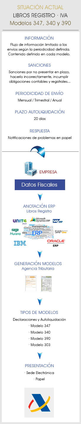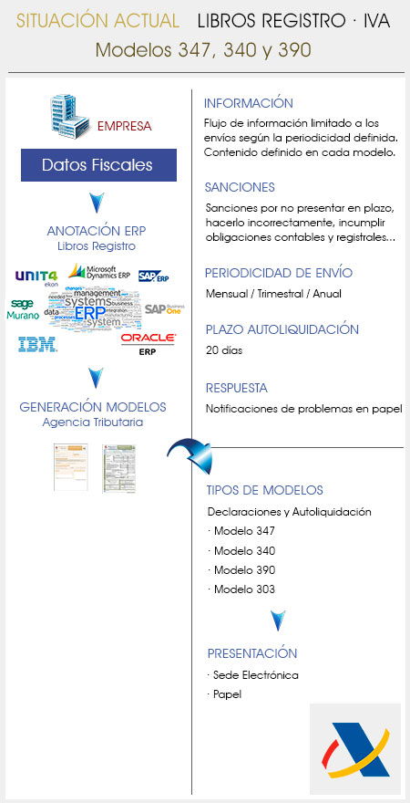 Actualmente las empresas presentan periódicamente los modelos 347, 340 y/o 390 con los datos de facturación, operaciones en libros registro y resumen anual del IVA. AL final del año también deben presentar la autoliquidación (modelo 303). La periodicidad puede ser mensual, trimestral o anual.